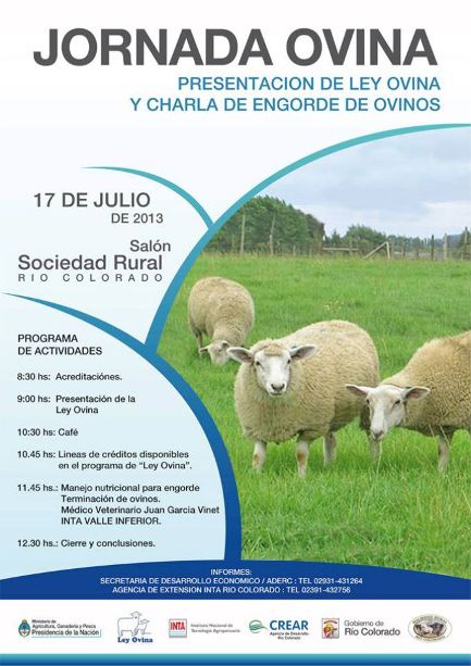 El 17 de Julio a las 9:00 en el salón de la Sociedad Rural de Río Colorado se realizará una jornada ovina donde se presentará la Ley Ovina y se charlará sobre engorde de ovinos.